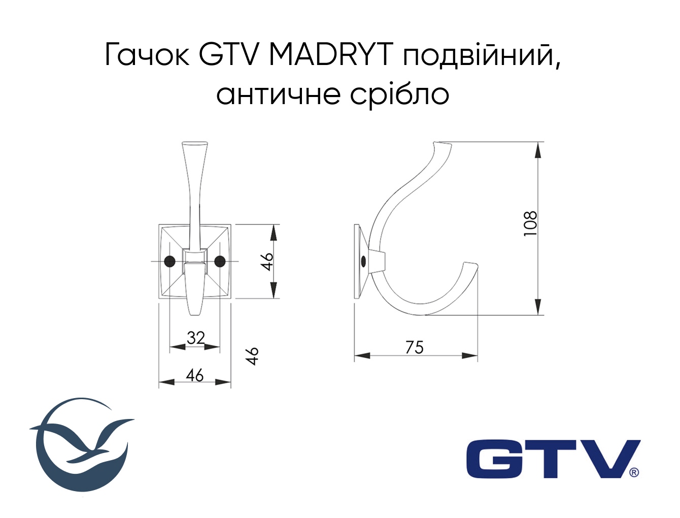 Мебельный крючок GTV MADRYT двойной, античное серебро