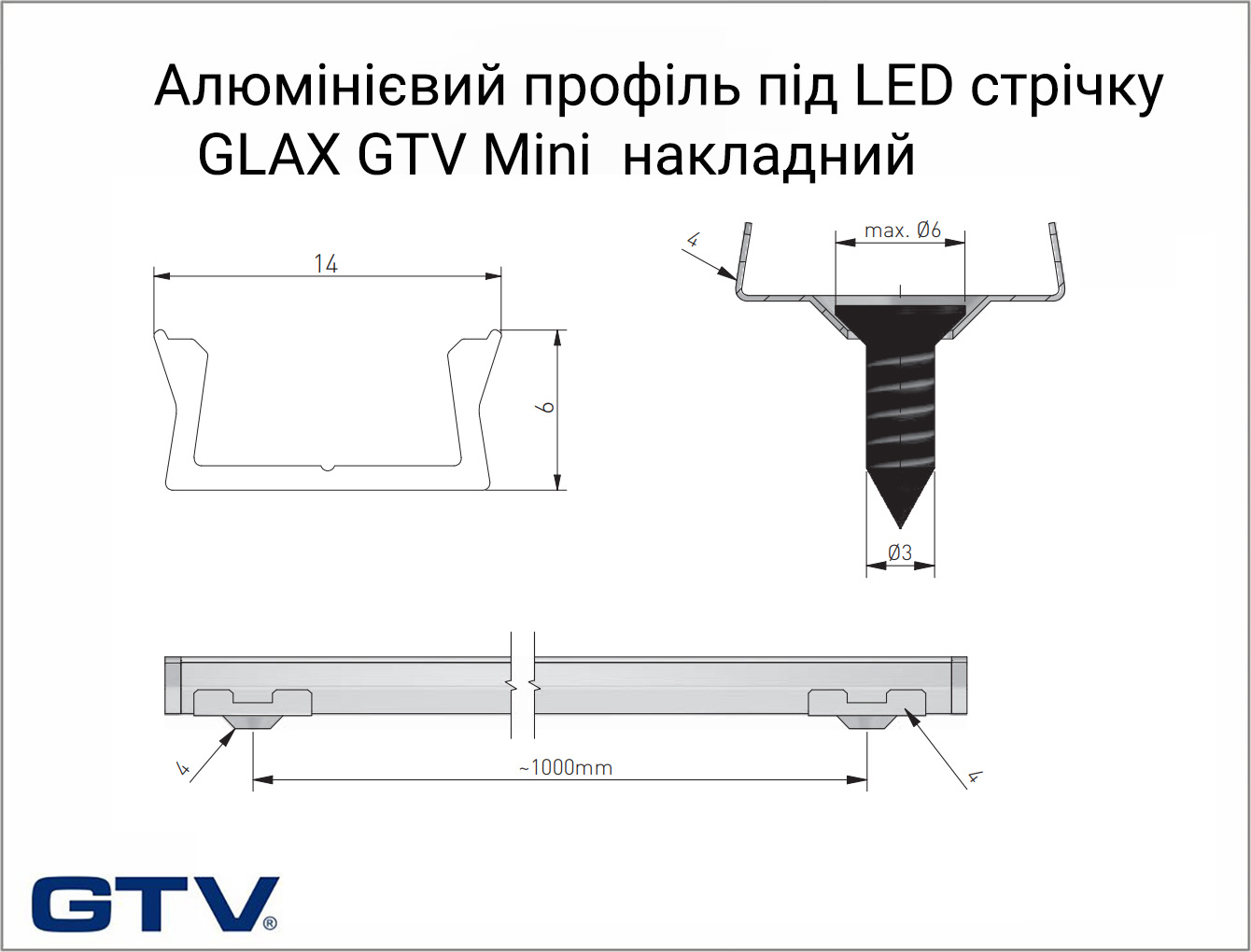 Алюминиевый профиль под LED ленту, GLAX GTV MINI L=3 м, накладной, черный