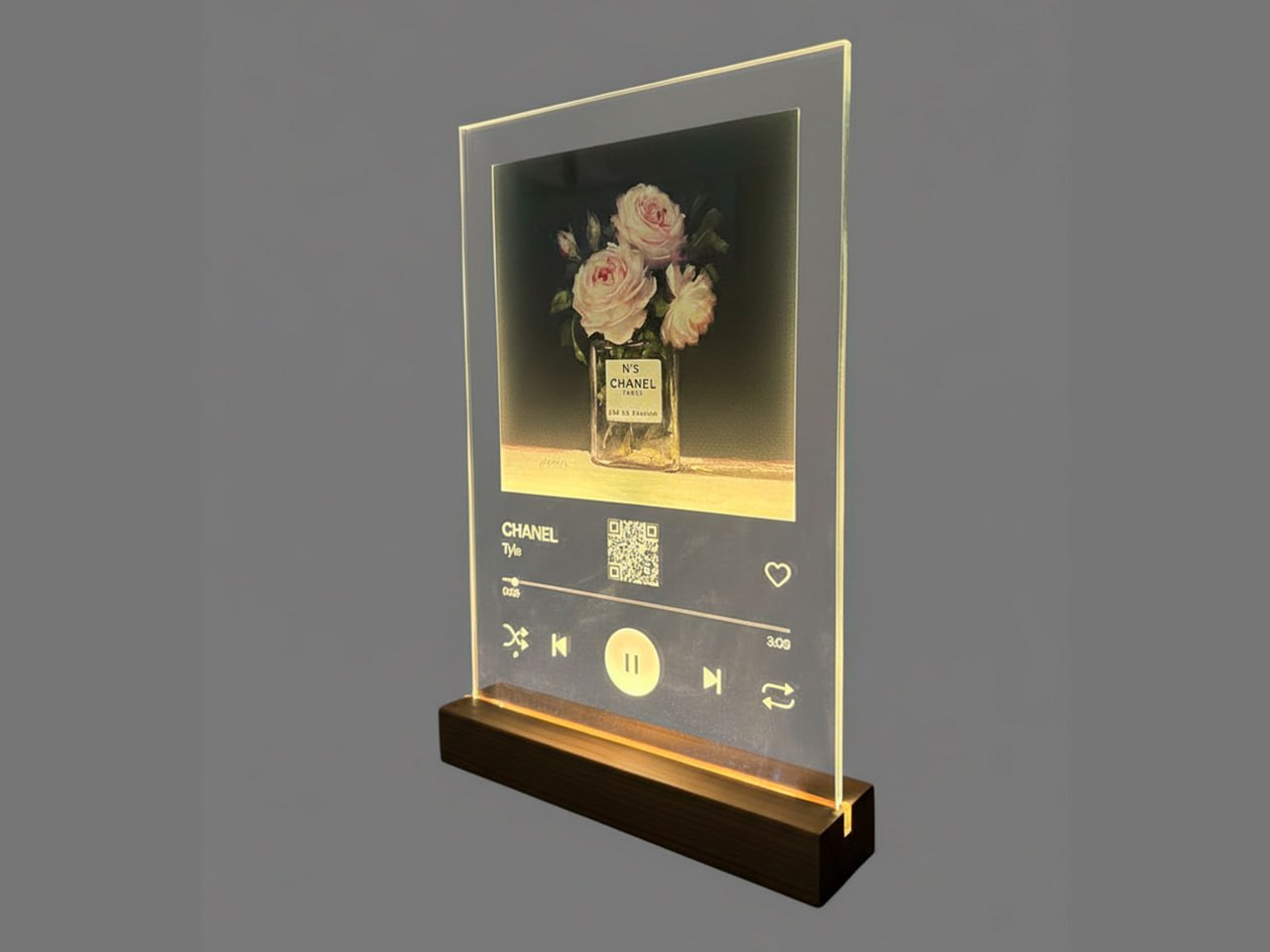 Оригинальный музыкальный постер на стекле формата А4 с подсветкой — это стильный элемент декора и уникальная идея подарка для тех, кто любит музыку и особенные воспоминания. На стекле можно разместить любое ваше фото и любимый трек, создав персональный арт с важной для вас композицией.