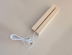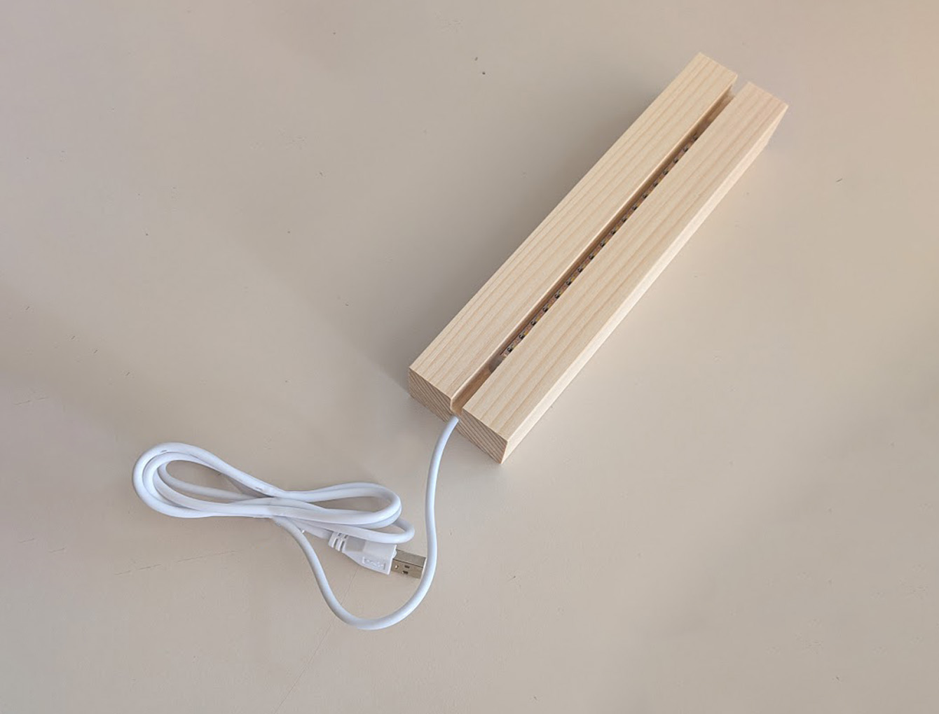 Подставка выполнена из натурального дерева и оснащена светодиодной лентой, которая мягко освещает стеклянный постер. Питание осуществляется через USB-кабель, поэтому подсветку удобно подключить к ноутбуку, адаптеру или power bank.