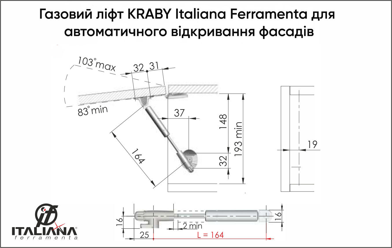 Газовий ліфт KRABY Italiana Ferramenta для автоматичного відкривання фасадів догори довжина 164мм N50