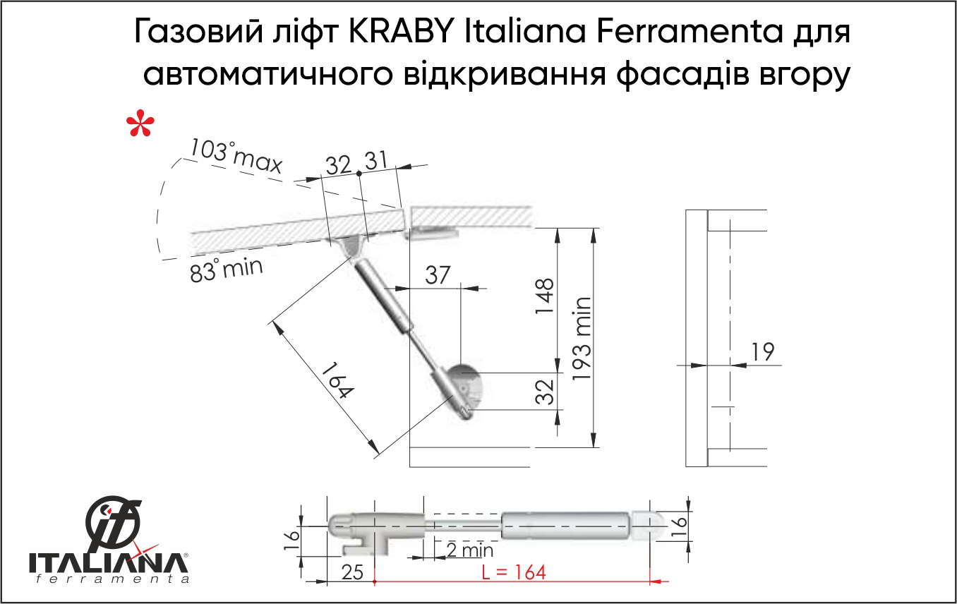 Газовий ліфт KRABY Italiana Ferramenta для автоматичного відкривання фасадів вгору довжина 164мм N80