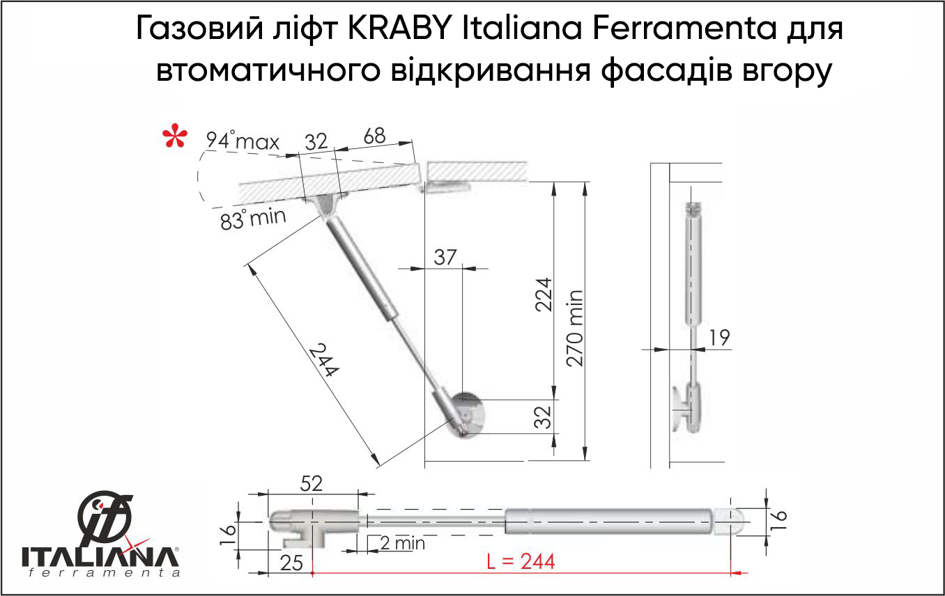 Газовий ліфт KRABY Italiana Ferramenta для автоматичного відкривання фасадів вгору довжина 244мм N100