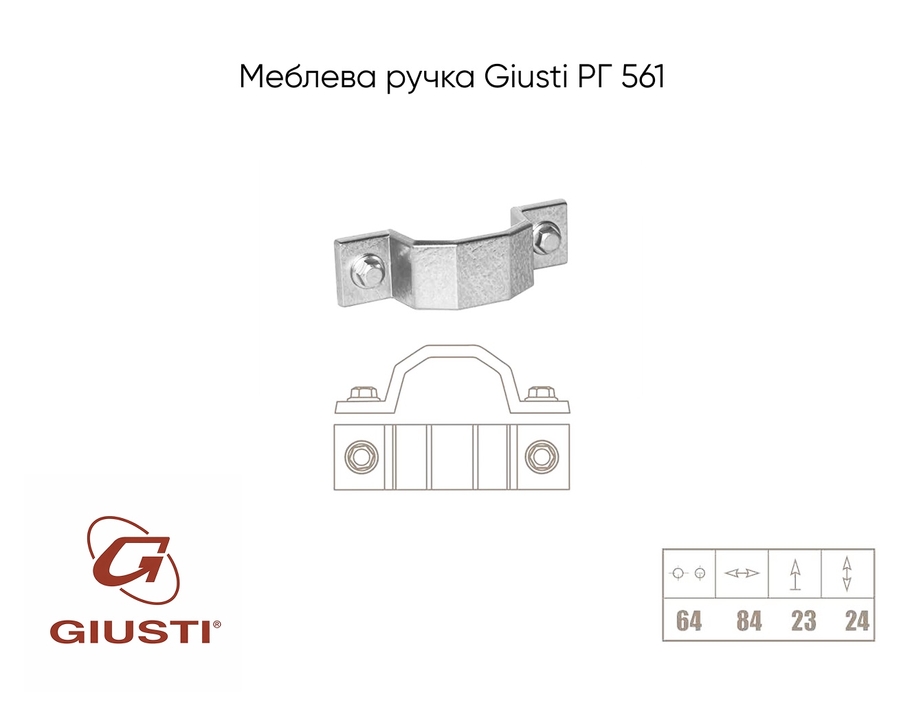 Відстань між отворами, мм: 64Італійська компанія Giusti є провідним виробником меблевих ручок. Колекція Evolve підійде до інтер'єру, оформленого в стилі Loft. Ручка - скоба є найбільш поширеним видом меблевої ручки і відрізняється особливою зручністю і простотою кріплення.