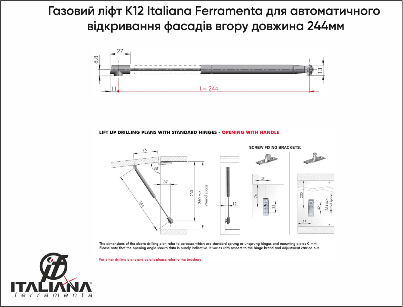 Газовий ліфт K12 Italiana Ferramenta для автоматичного відкривання фасадів вгору довжина 244мм N50