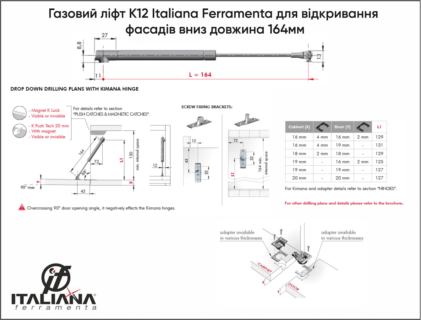 Газовий ліфт K12 Italiana Ferramenta для відкривання фасадів вниз довжина 164мм