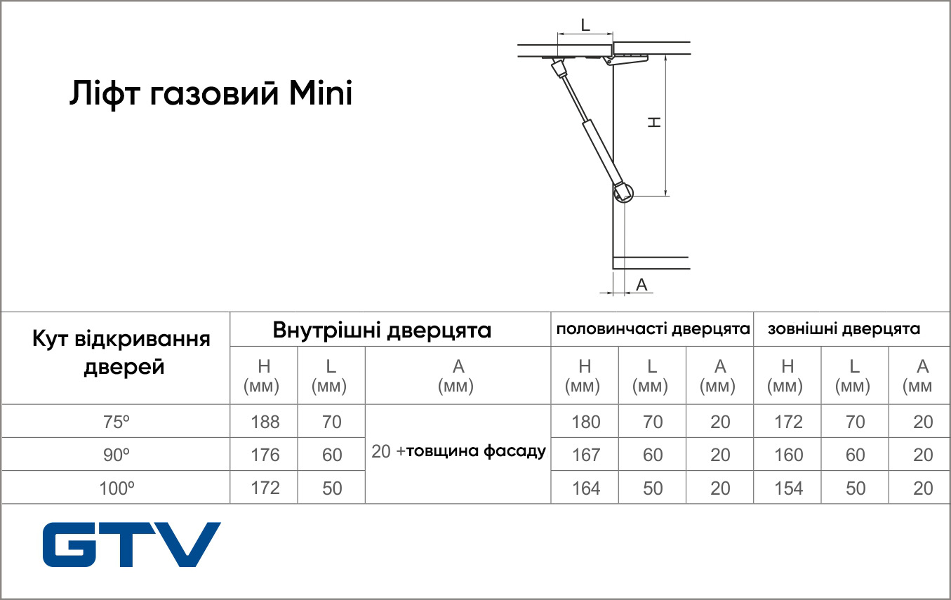 Всі меблеві амортизатори GTV, без проблем встановлюються на всі типи дверей і петель - накладні, 1/2 і внутрішні і мають три кути відкривання - 75 градусів, 90 градусів, 100 градусів.