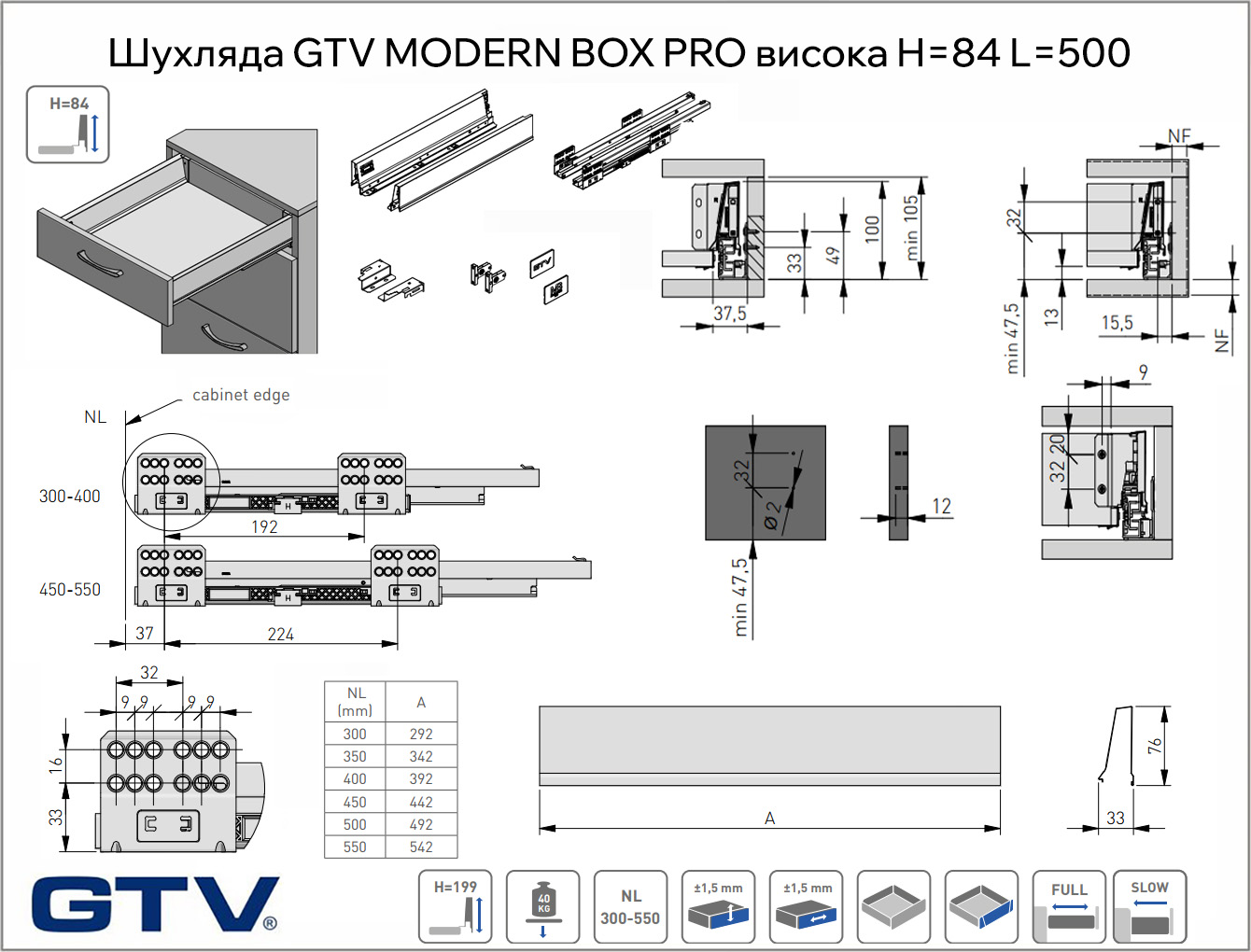 Регулювання фасаду у вертикальній та горизонтальній площинах (+/- 1,5 мм).Modern Box Pro - в першу чергу це ергономічне і сучасне рішення для кухні, але також підійде до будь-яких інших меблів, де передбачені висувні шухляди. Модерн бокс Про ідеально підходить як для невеликих приміщень, де важливий кожен вільний сантиметр, так і для великих приміщень, що пропонують великі можливості облаштування. При проектуванні меблевого виробу необхідно врахувати технічну відмітку від виробника; для правильної роботи напрямної рекомендована ширина скриньки не повинна перевищувати номінальної довжини напрямної. Для даної моделі номінальна довжина напрямних = 500 мм.