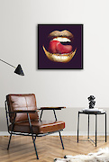 На темно-фіолетовому фоні виділяються золоті губи, що витончено контрастують з оточенням. Верхня губа облизується язиком, надаючи образу грайливу нотку. Ця картина чудово доповнить сучасний інтер'єр вітальні чи спальні, додаючи до нього загадковості та вишуканості. Її елегантний стиль та яскравий акцент привернуть увагу та стануть фокусом у будь-якому сучасному просторі.