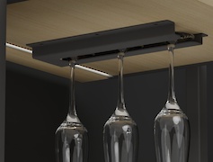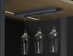 Бокальниця дозволяє повісити винні келихи нагору ногами, за їх ніжку. Вона кріпиться до полиці або дна модуля за допомогою шурупів. Одна з головних переваг такого власника – економія місця. Келихи знаходяться у тримачі, що звільняє цінний простір на полицях та столах. Крім того, келихи завжди залишаються під рукою. Ви можете легко дістати їх, коли потрібно налити вино або подавати напої.