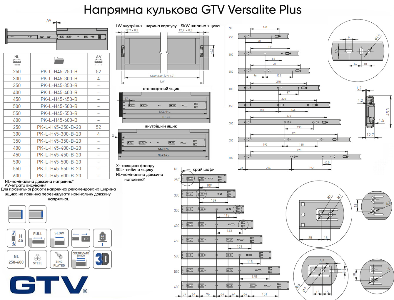 Напрямна кулькова GTV Versalite Plus+ Н=45 L=400 мм повного висування з дотягувачем (PK-L-H45-400-B) чорний
