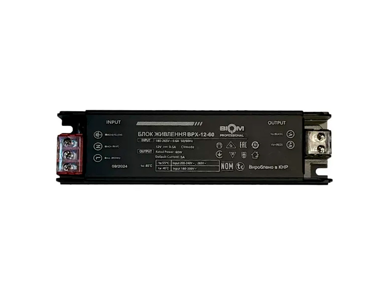 Блок живлення BIOM Professional 12V 60W BPX-60, 5А Напруга: DC 12 V Потужність: 60 W Струм на виході: 5 A Робоча напруга: AC 180-265 V Охолодження: ПАСИВНЕ Клас захисту: IP20 Розміри: 138x36x24мм