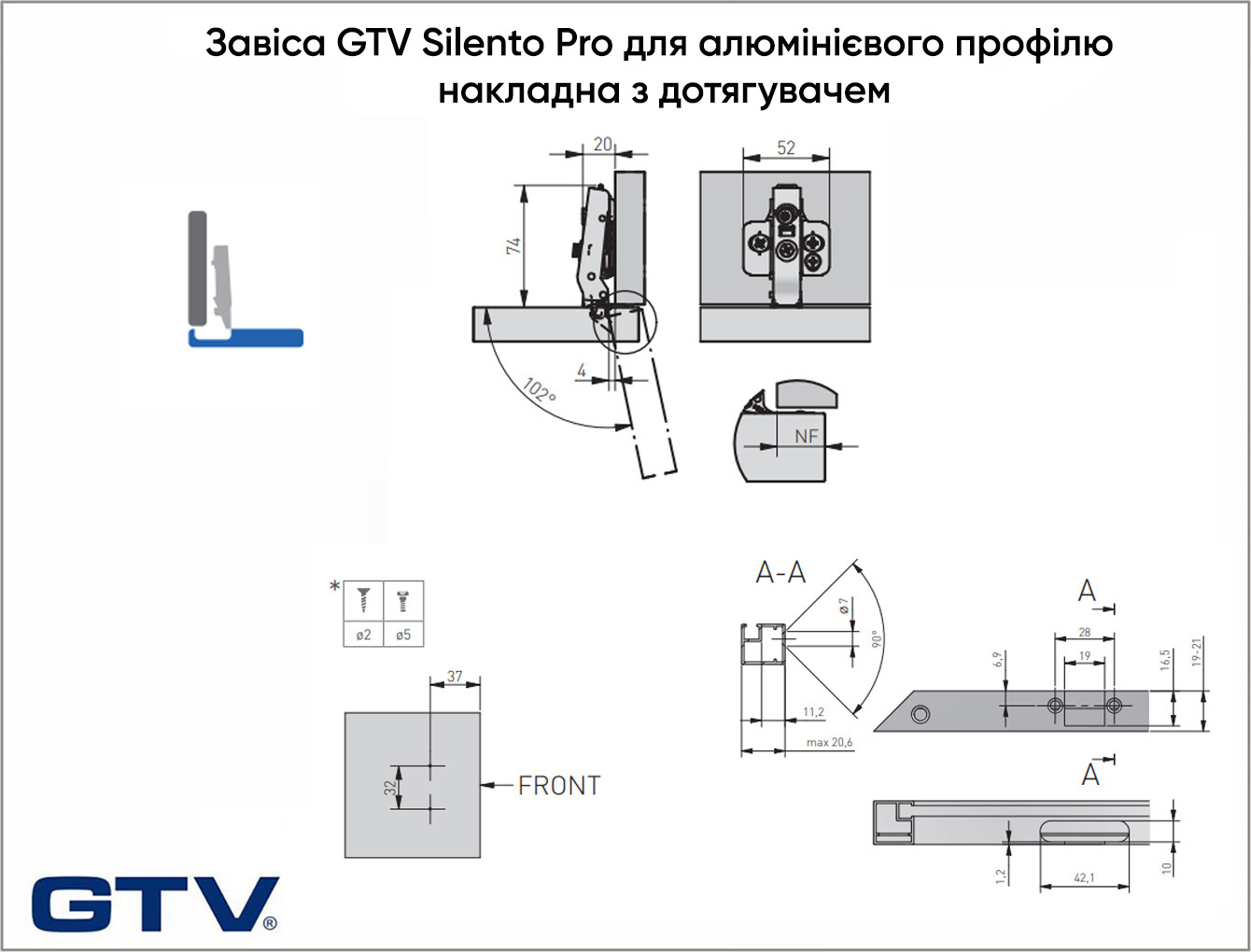 Завіса GTV Silento Pro для алюмінієвого профілю накладна з дотягувачем, H=0, чорна