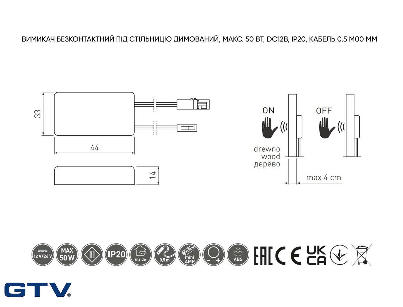 Вимикач безконтактний під стільницю димований, макс. 50 Вт, DC12В, IP20, кабель 0.5 м