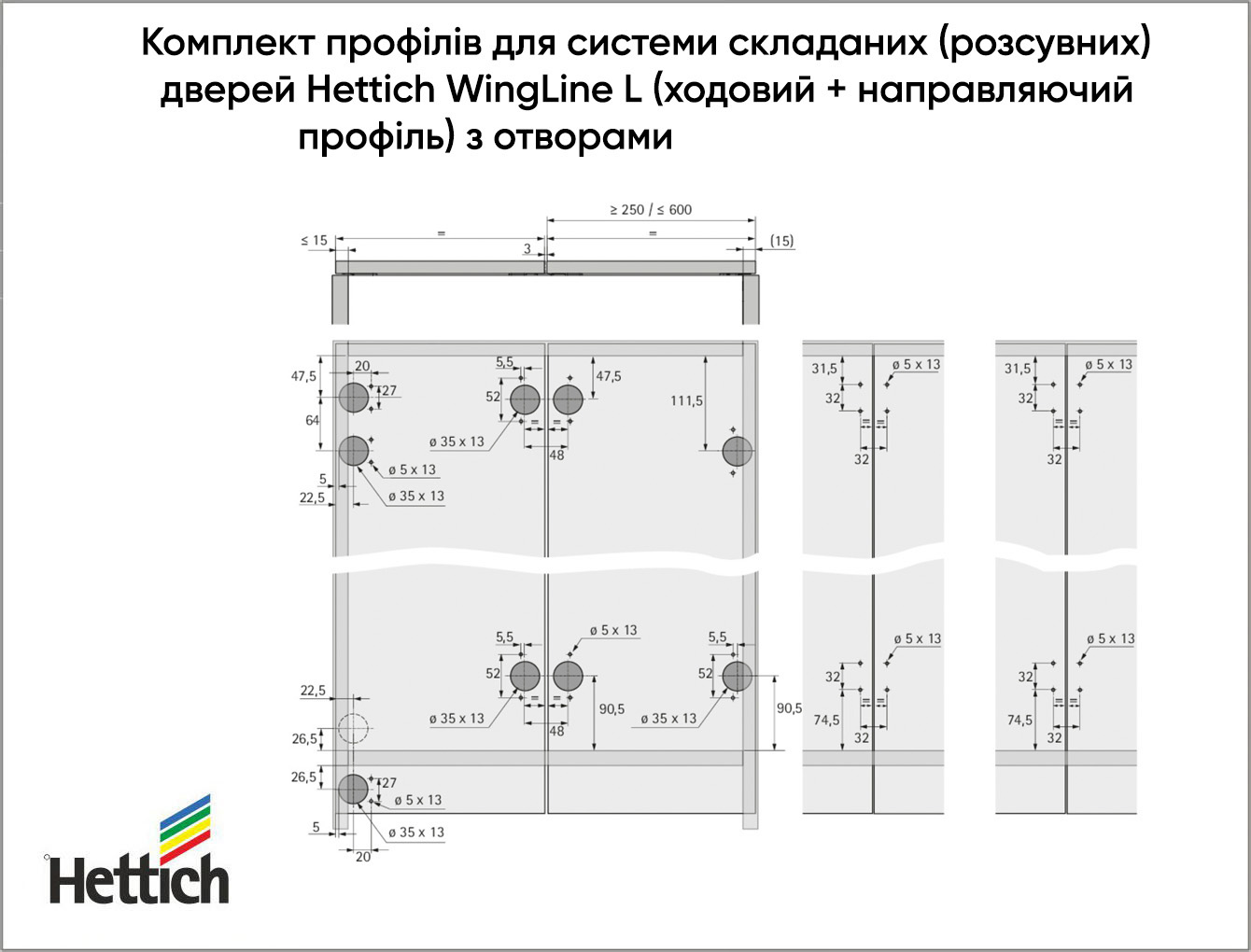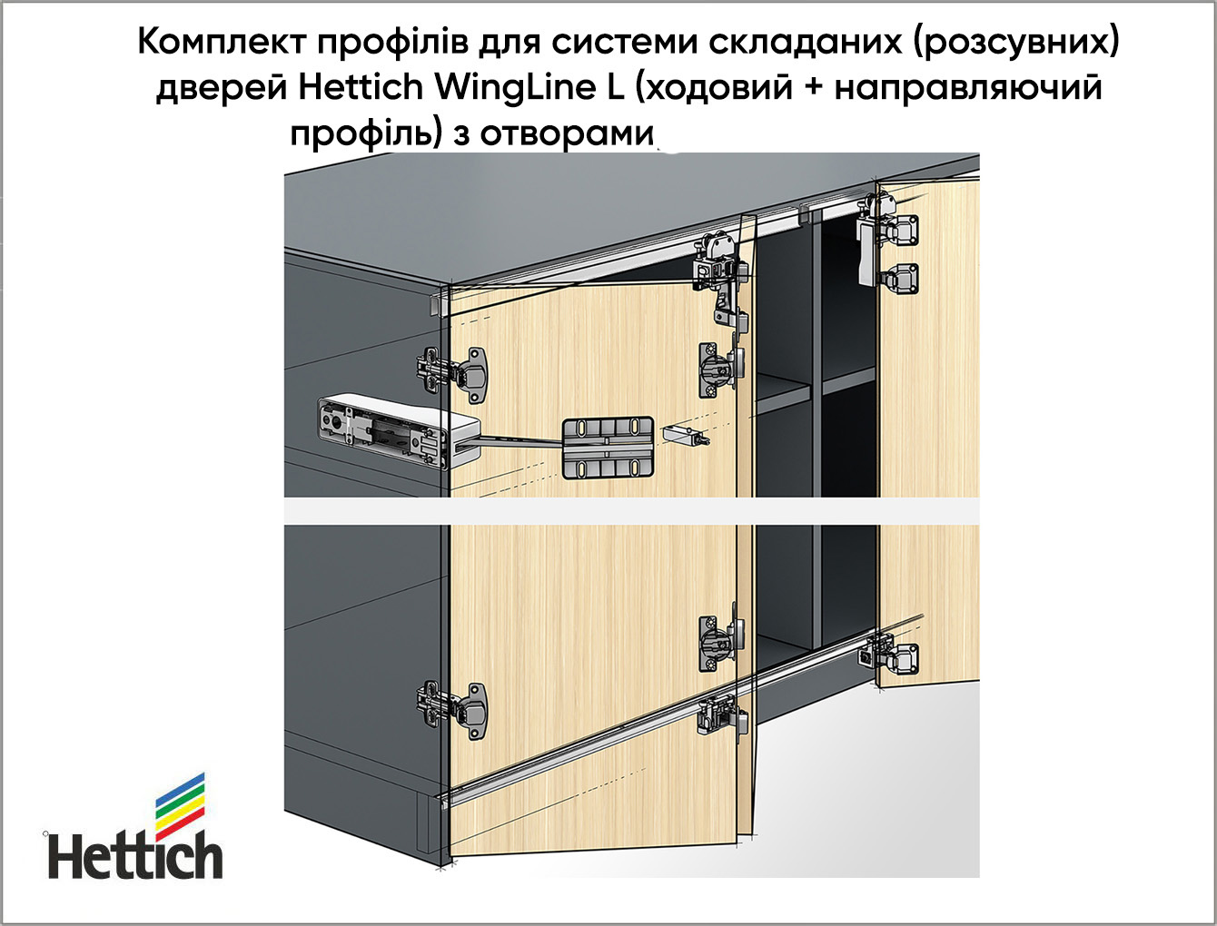 Комплект профілів для системи складаних (розсувних) дверей Hettich WingLine L (ходовий + направляючий профіль) з отворами, 2400 мм, білий