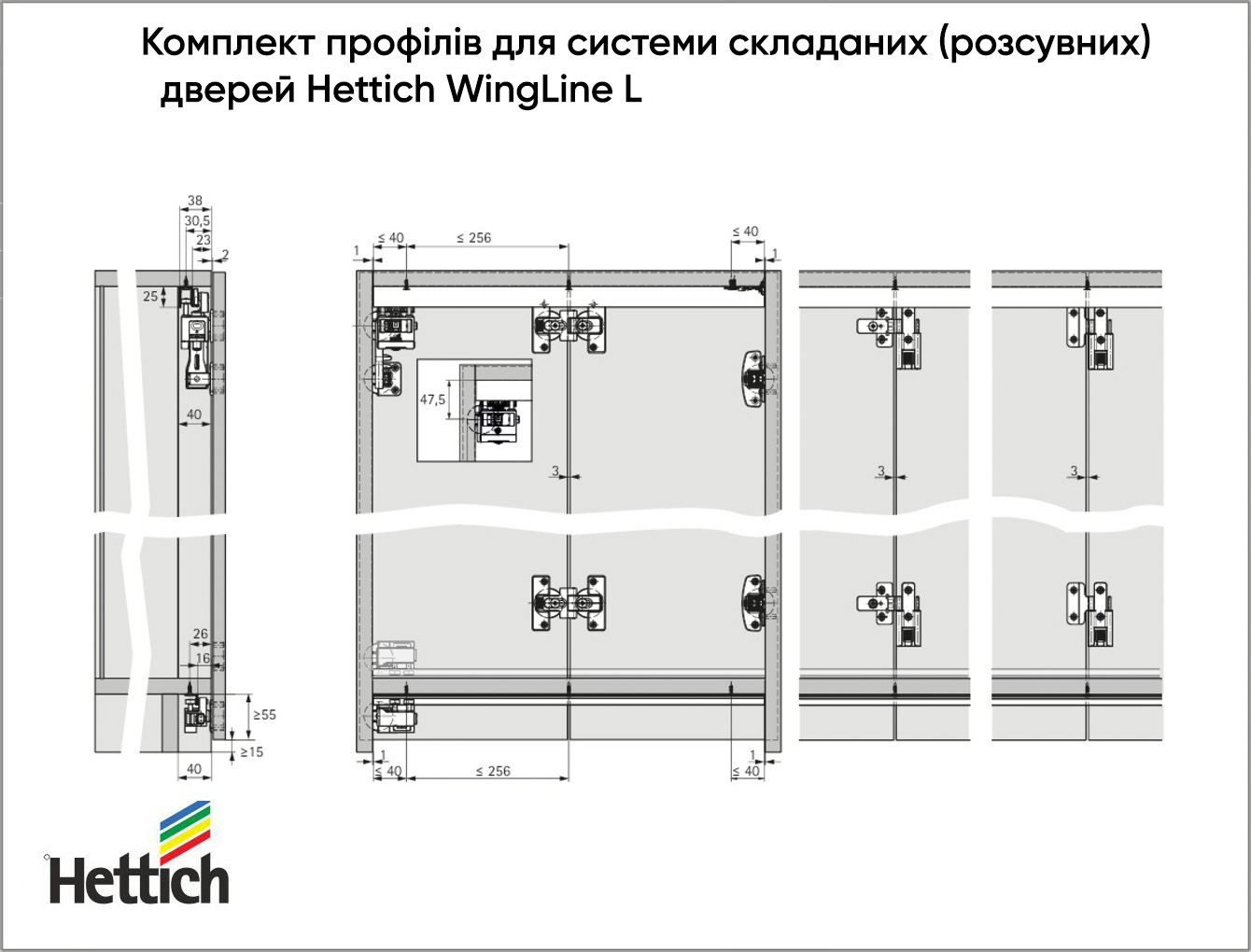 Комплект профілів для системи складаних (розсувних) дверей Hettich WingLine L (ходовий профіль) з отворами, 1200 мм, білий