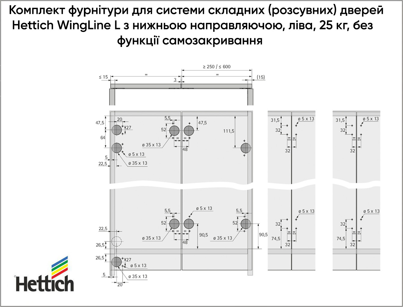 Комплект фурнітури для системи складних (розсувних) дверей Hettich WingLine L з нижньою направляючою, ліва, 25 кг, без функції самозакривання, білий