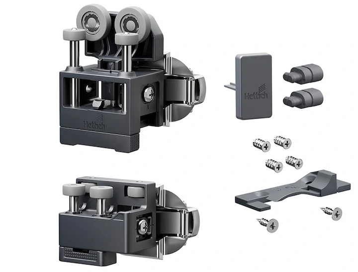 - У комплект входять усі необхідні компоненти для однієї складної двері з 2 створками, включаючи ходовий елемент з двома петлями, напрямний елемент для монтажу під нижню панель, заглушку та кріплення
