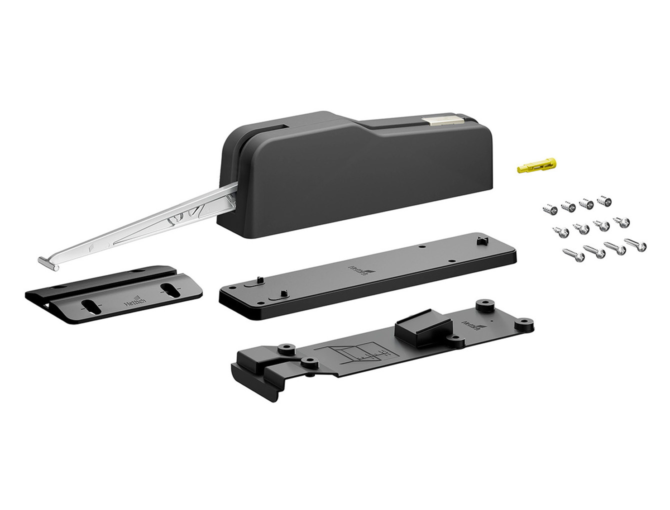 У комплект входять механізм відкривання, заглушка, напрямний елемент, кріплення та свердлильний шаблон