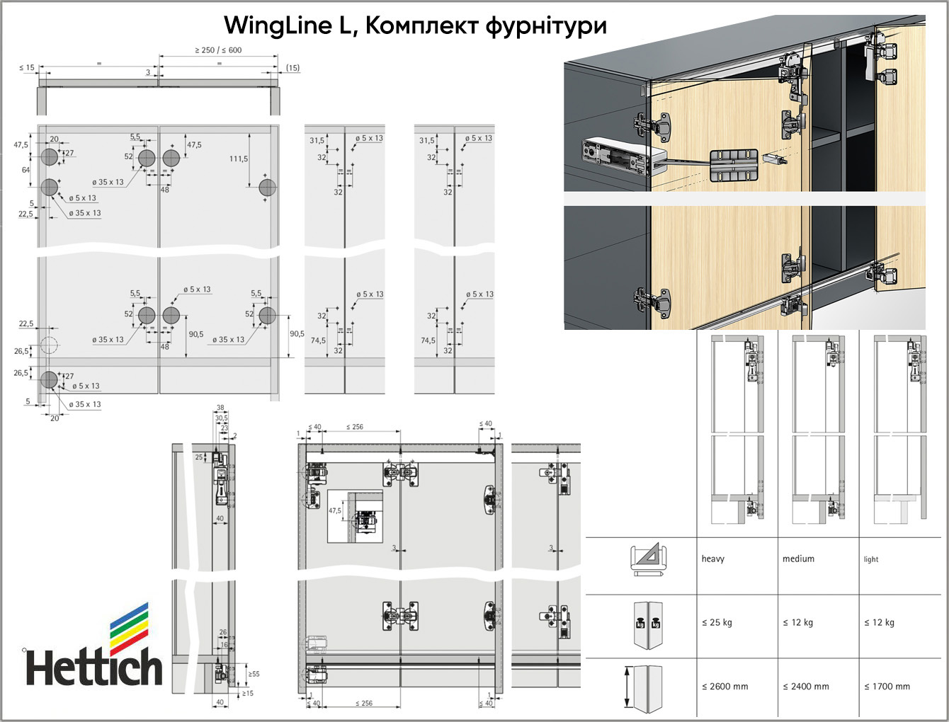 Комплект для системи складних/розсувних дверей Hettich WingLine L light без нижньої напрямної, правий, 12кг, без функції самозакривання
