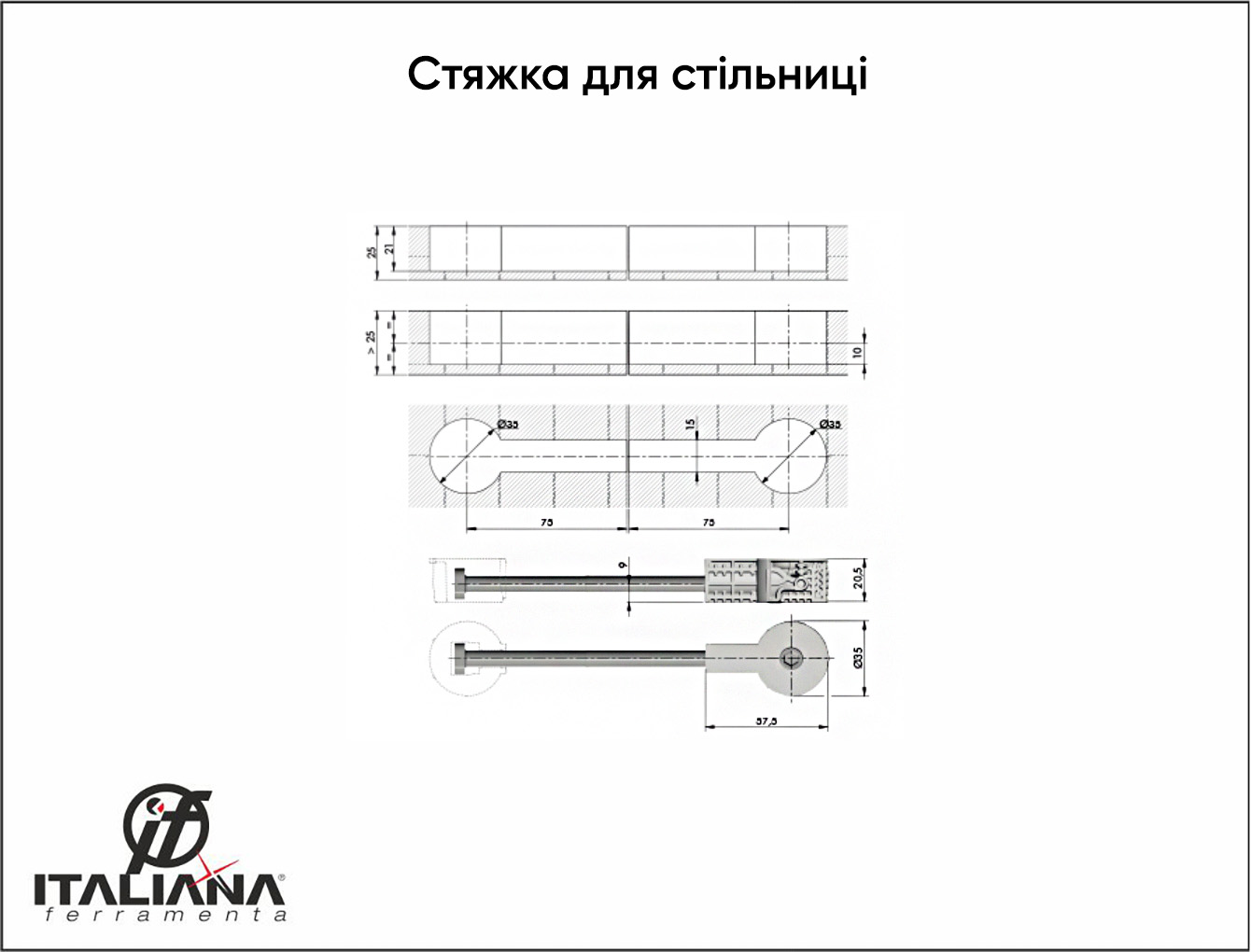 Стяжка для стільниці QUICK TECH 35 Italiana Ferramenta для корпусу діаметром 35мм довжина 150мм