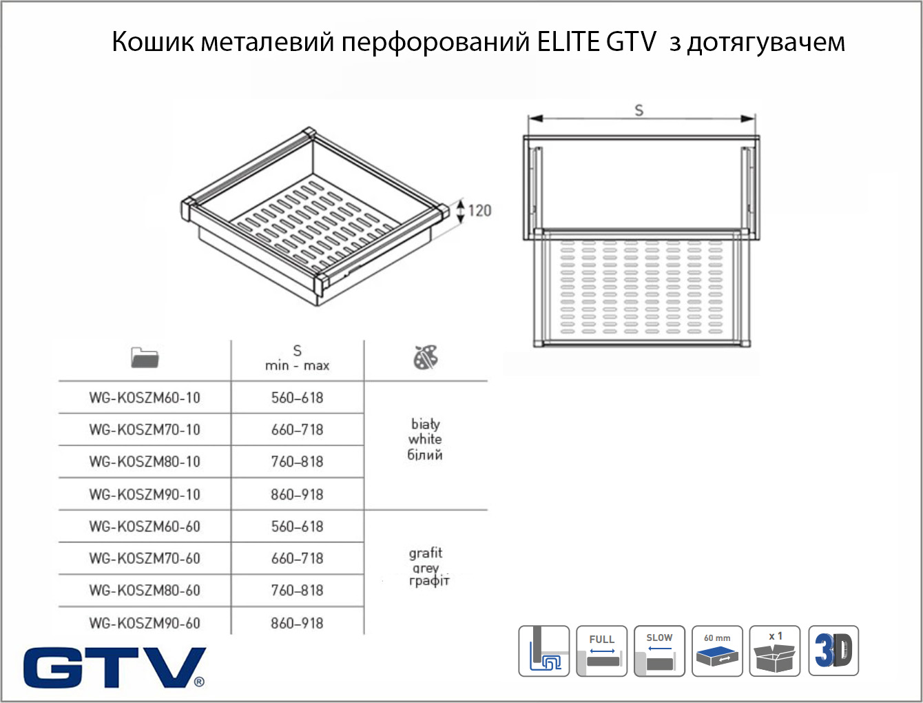 Кошик металевий перфорований ELITE GTV 700мм, з дотягувачем, білий